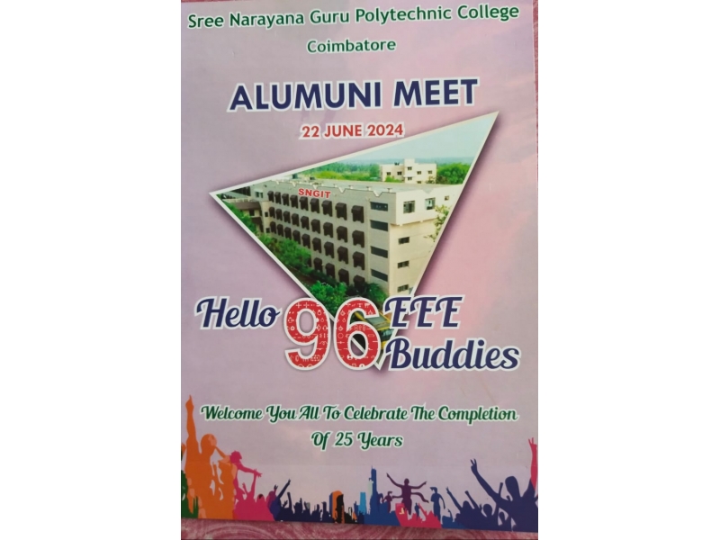 It is a pride movement for SNGPC to Welcome the Alumnus of 1996 Batch EEE Students for a gathering in the campus to celebrate the 25th Year of completion on 22nd June 2024 at 9.00 am in the Seminar Hall. The memories and experience will be shared among each other for a purpose to grow.