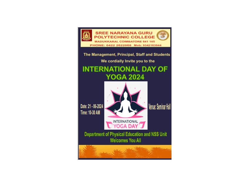 The Department of Physical Education and NSS, Unit jointly organizes a Yoga Session and Poster making Competition on the International Day of Yoga 21st June 2024 in the Seminar Hall, SNGPC at 10-30 AM.