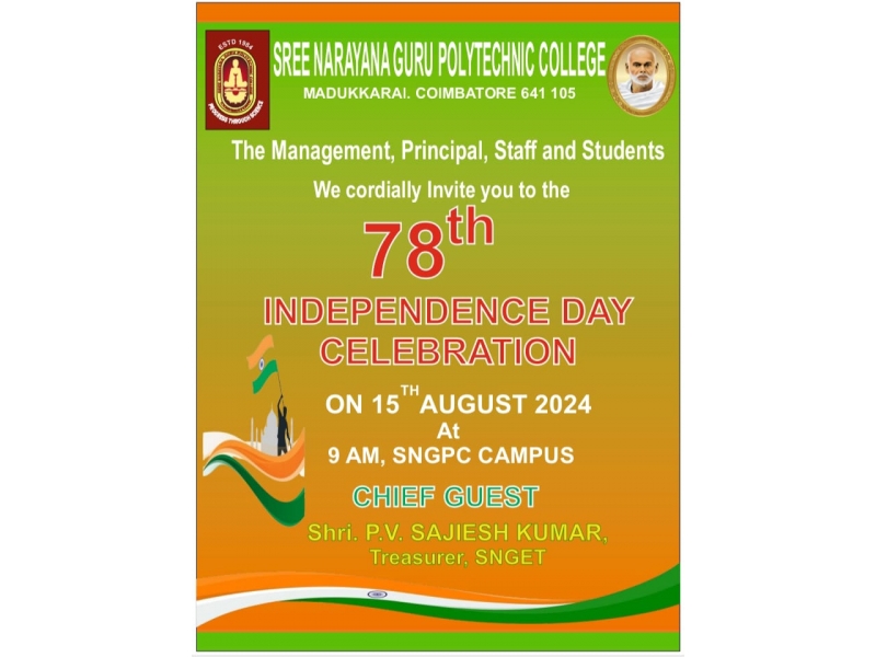 SNGPC is celebrating the 78th Independence Day on 15th August 2024 in the campus. Shri. V. Sajiesh Kumar, Treasurer, SNGET will hoist the National Flag and address the gathering.