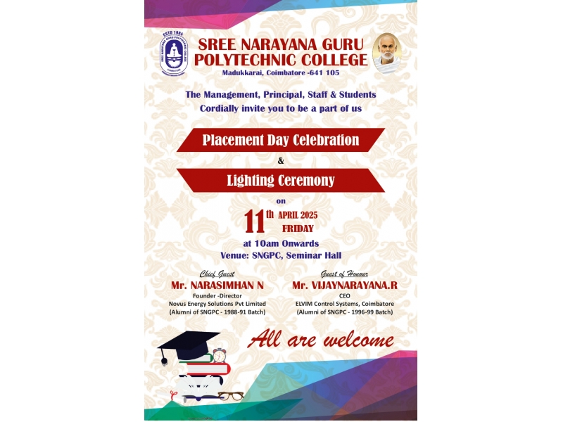 SNGPC will celebrate its PLACEMENT DAY on 11th APril 2025 at Seminar Hall in the Campus with the LIGHTING CEREMONY.