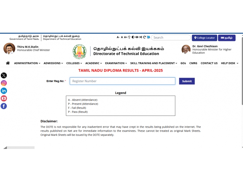 The Board Examination Result for April 2025 is published in the DOTE Website. Click the given link and check your Results. https://dte.tn.gov.in/diploma-results