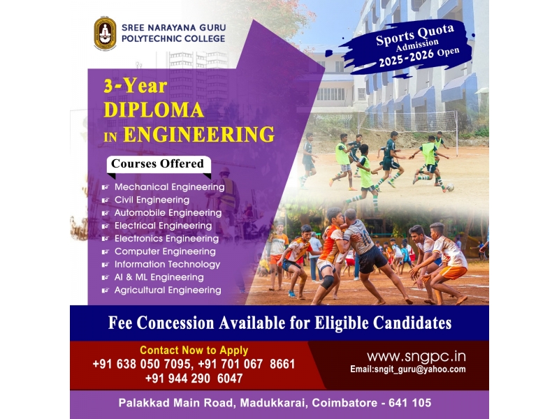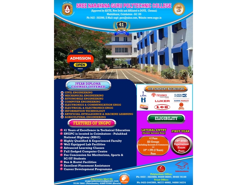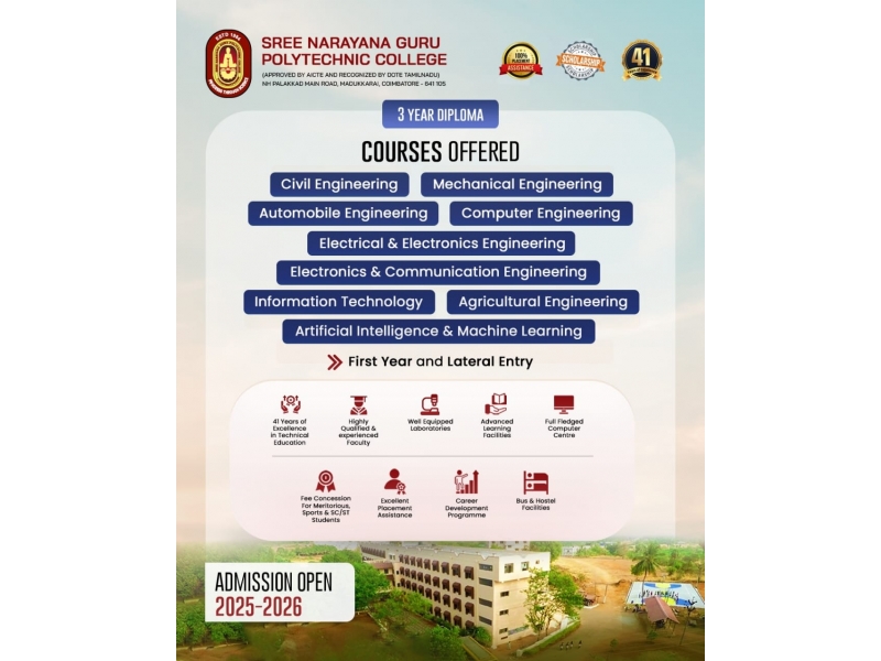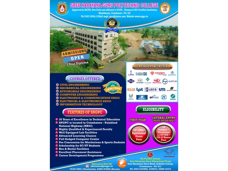 Get exciting courses, in civil engineering, mechanical engineering, automobile engineering, computer engineering, electronics & communication engineering, electrical & electronics engineering, and information technology. With features, bus and hostel facilities, fee concession for meritorious and sports students, and more.