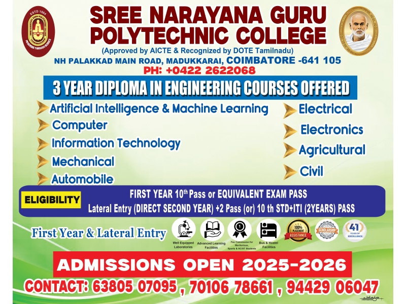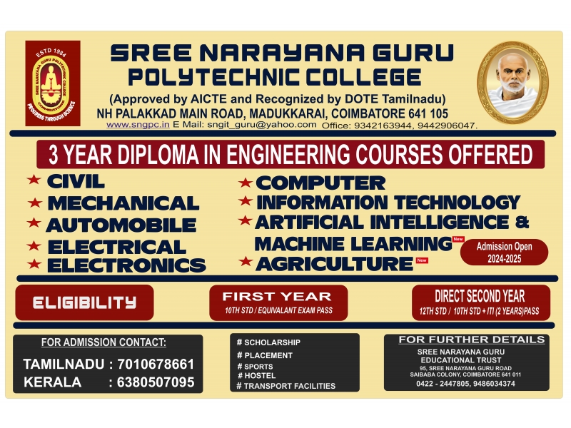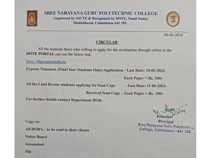 As per the instruction of the Directorate of Technical Education (DOTE) our college will Re-Open for the Academic Year 2024-2025 on 11 th June 2024 to all the II Year and III Year students.