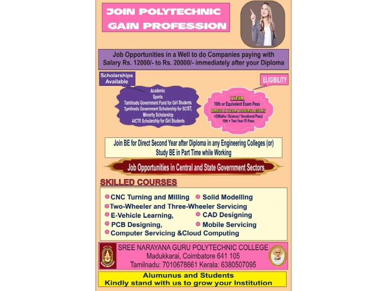 Get job opportunities from government sectors with skilled courses like, CNC Turning and milling, Solid Modelling, Two-Wheeler and Three-Wheeler Servicing, E-Vehicle Learning, CAD Designing, PCB Designing, Mobile Servicing Computer Servicing &Cloud Computing. Admissions 2024-25 are open now.